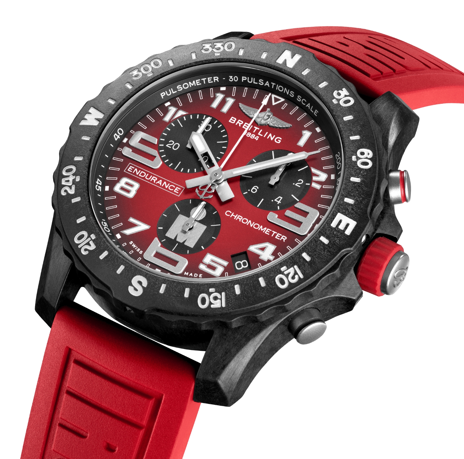 Breitling’s IRONMAN® edition lightweight Endurance Pro watch. Designed for men and women whose active lives blend a professional mindset with a sporty lifestyle, the Endurance Pro is equal to the challenges of a rigorous workout but fashionable enough for everyday wear. The Endurance Pro features an ultra-light Breitlight® case, a robust material 3.3 times lighter than titanium and 5.8 times lighter than stainless steel. Non-magnetic, thermally stable and hypoallergenic, Breitlight® is highly resistant to scratches, traction and corrosion. It also has a touch that is warmer than metal and a slightly textured effect accentuating the originality of the design. Exclusive to Breitling, it is 100% Swiss-made. Offered with a distinctive IRONMAN® red dial and branded rubber strap – fitting a Breitlight® double tang-type buckle, the Endurance Pro IRONMAN® is powered by the Breitling Caliber 82, a COSC-certified SuperQuartz™ chronograph delivering exceptional precision.