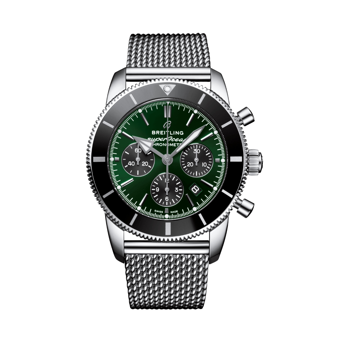 Inspired by the original Superocean from the 1950s, the Superocean Heritage combines iconic design features with a modern touch. Sporty and elegant, the Superocean Heritage is a true embodiment of style at sea. This Superocean Heritage featuring a black-eye green dial is limited to 500 pieces. Featuring the iconic triangular-shaped hands as well as a unidirectional bezel with a polished ceramic ring, the Superocean Heritage is an elegant looking diver’s watch. Available in a variety of materials including stainless steel and 18k red gold, the Superocean Heritage B01 Chronograph 44 features a range of black, blue, silver, or green dials. Offered either with a matching mesh bracelet, or a “mesh-styled” rubber strap fitting a folding buckle, this Superocean Heritage is powered by the in-house Breitling Manufacture Caliber 01, a COSC-certified chronometer.
