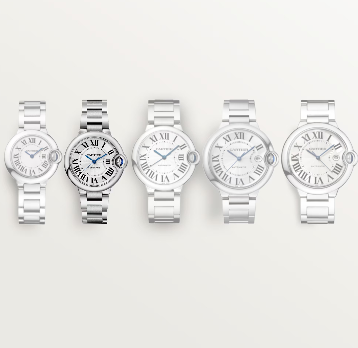 Cartier Ballon Bleu WSBB0044 self-winding automatic watch features a 33mm stainless steel case surrounding a silver textured dial on a stainless steel bracelet with folding buckle. Functions include hours, minutes and seconds. This watch is water resistant to 30m.